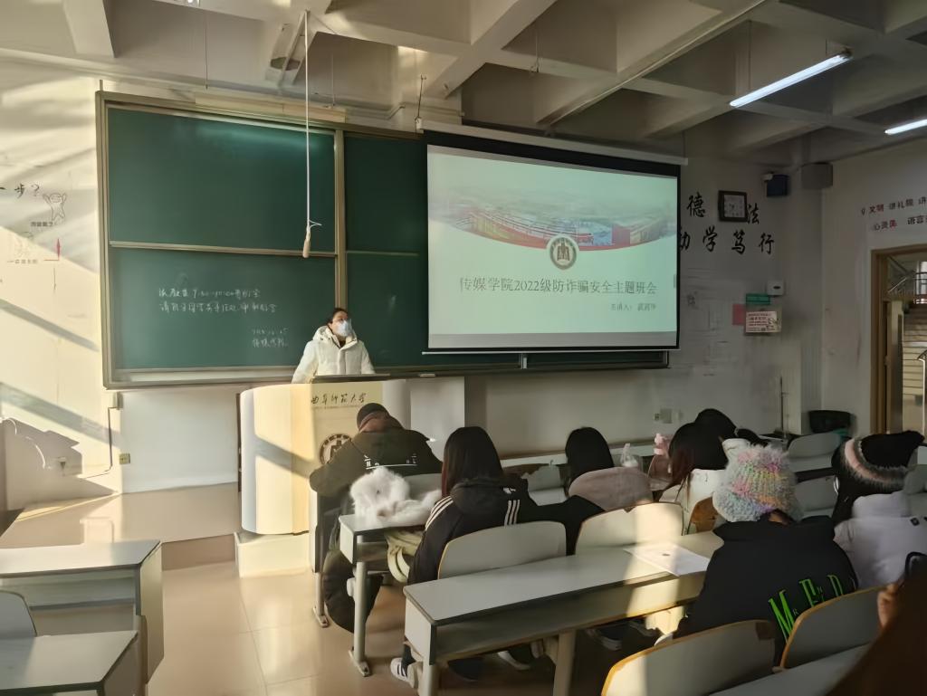 为进一步增强学生防范诈骗的意识和能力,切实遏制校园诈骗案件的发生,传媒学院于12月25日组织开展了防诈骗安全主题班会。班会由传媒学院各年级辅导员担任主讲,全体学生参加。