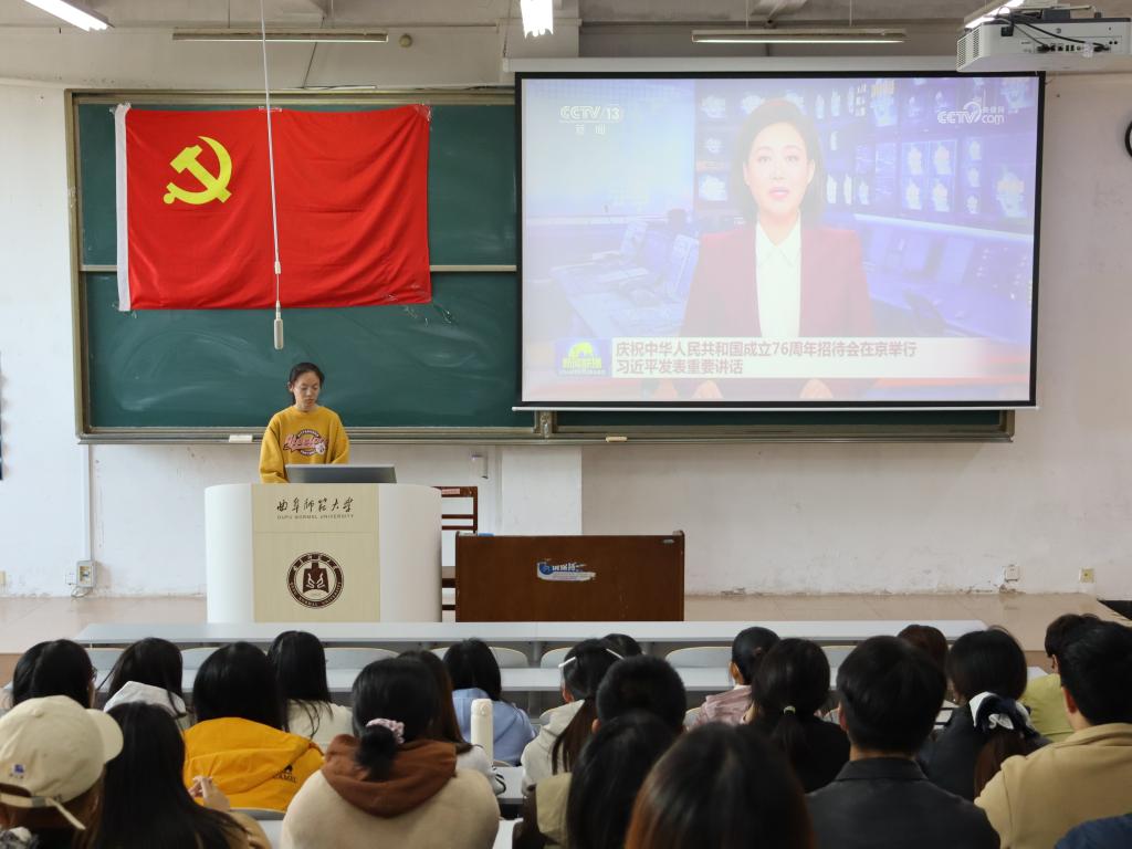 会议还组织全体党员观看了曲阜师范大学校史宣传片,重温学校七十载不平凡的办学历程。一幕幕珍贵的历史画面,激发了大家身为“曲园人”的自豪感,进一步坚定了党员们回馈母校、报效祖国的信念与决心。会上,全体党员通过微信扫码在线填写了《大学生党员先锋承诺书》,以庄严的形式表达对党的忠诚、对教育事业的热忱。此外,全体党员共同唱响曲阜师范大学校歌《犁牛之子歌》,用歌声表达对学校七十周年校庆的祝福和对美好未来的憧憬。