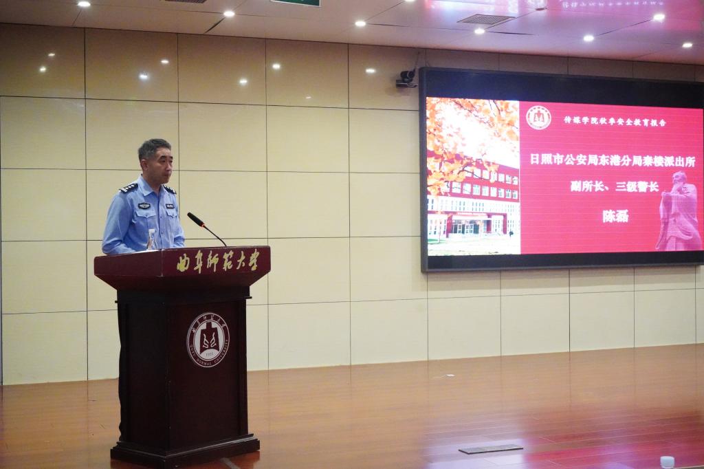 为切实加强学生安全防范意识,筑牢校园安全防线,9月27日,传媒学院邀请日照市公安局东港分局秦楼派出所副所长陈磊、日照市心脏病医院医师戴启睿于图书馆报告厅为传媒学子作安全教育讲座。日照校区党委副书记刘天浩、保卫处副处长王光江、学生工作处(武装部)副部长赵秀臣、教务处副处长孔峰、传媒学院党委书记田维柱、党委副书记田荣林及学院全体辅导员出席讲座,2024级、2025级传媒学子共同参加。
